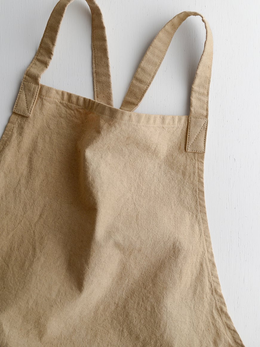 料理の時には勿論、手仕事での作業中など洋服が汚れてほしくない場面で使い勝手がよいショート丈のワークエプロン。