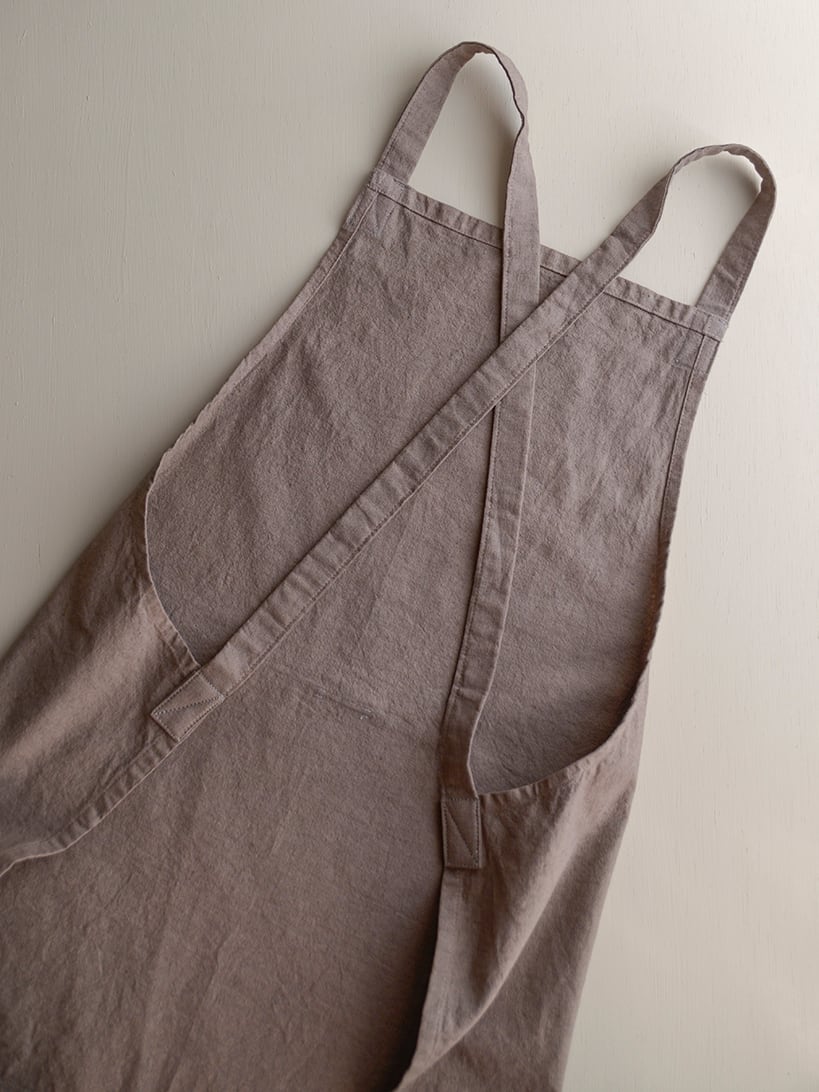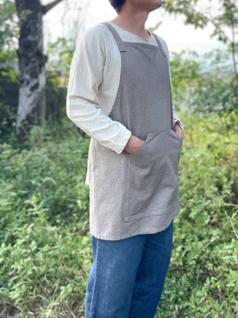様々な生地で制作してきましたが程よく厚みとハリ感のある、リネンコットン生地がお勧めです。ショート丈モデルで大変動きやすく様々なシーンでお使いいただけるエプロンです。
