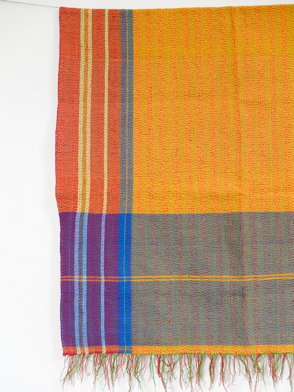 サリーの織り生地から引き出した糸を使用し、ちいさなラインステッチを繰り返し布を縫い合わせる。