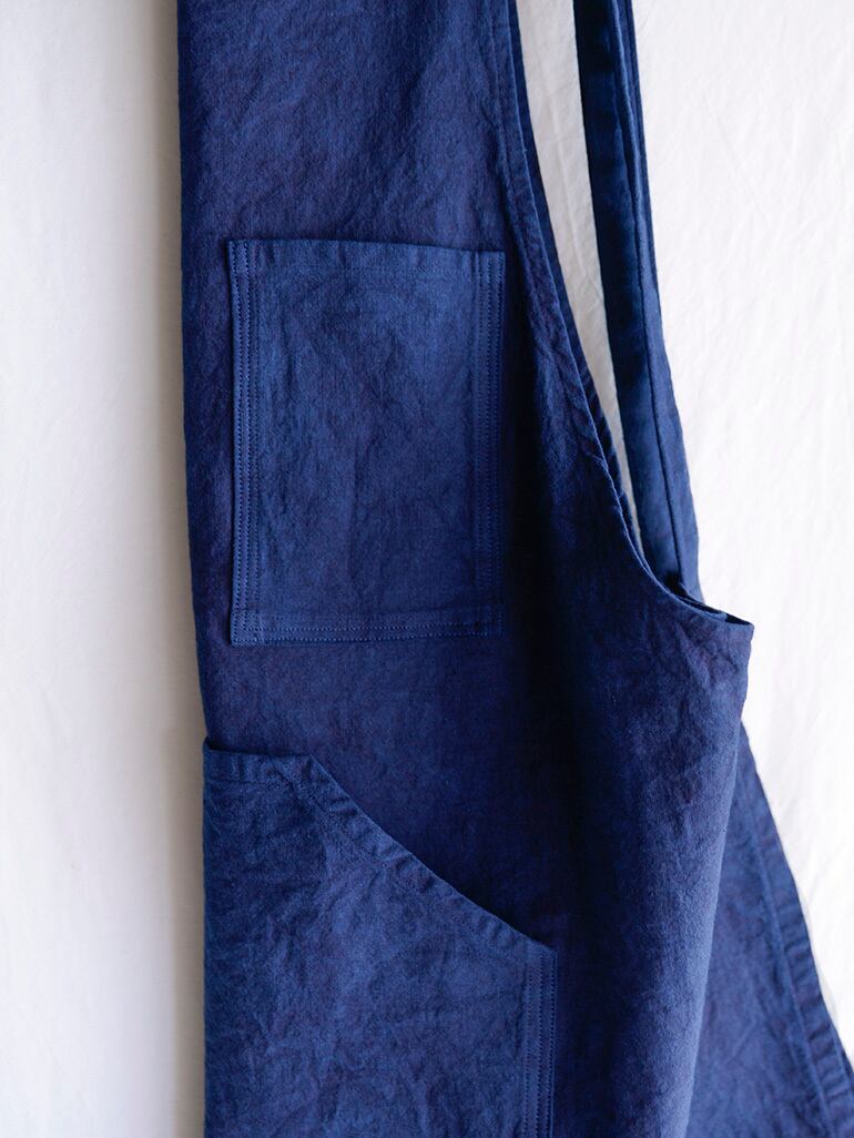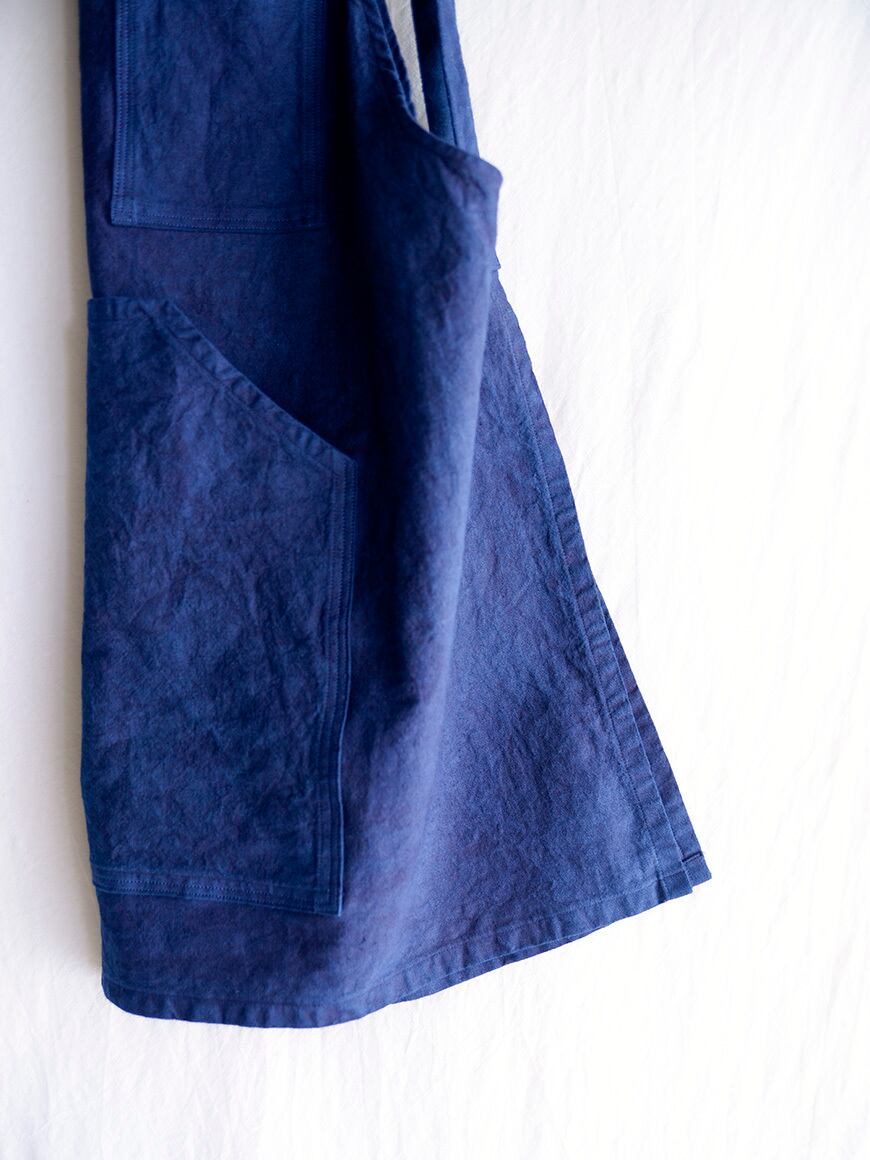 料理の時には勿論、手仕事での作業中など洋服が汚れてほしくない場面で使い勝手がよいショート丈のワークエプロン。